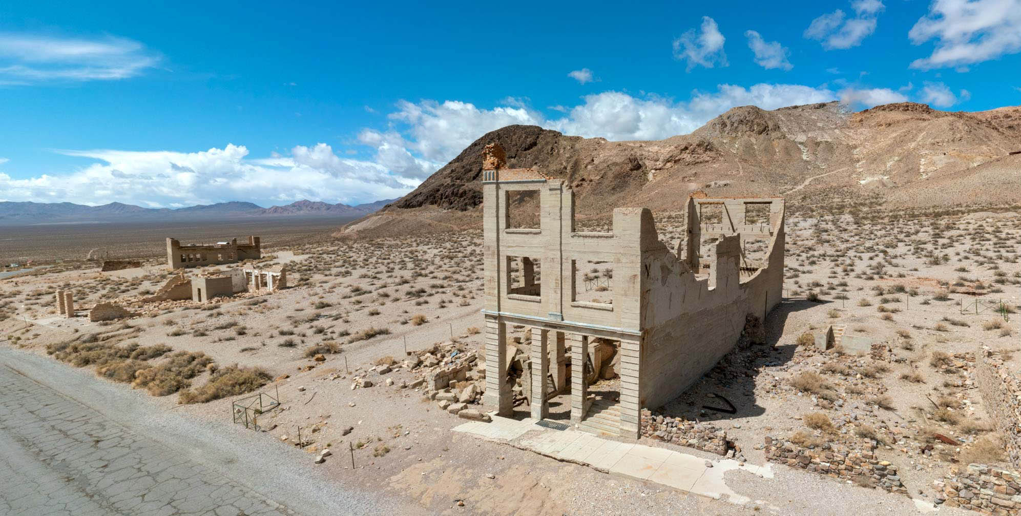 Rhyolite’s boosters set out to build a city, not a canvas camp. By 1907 the town could claim: