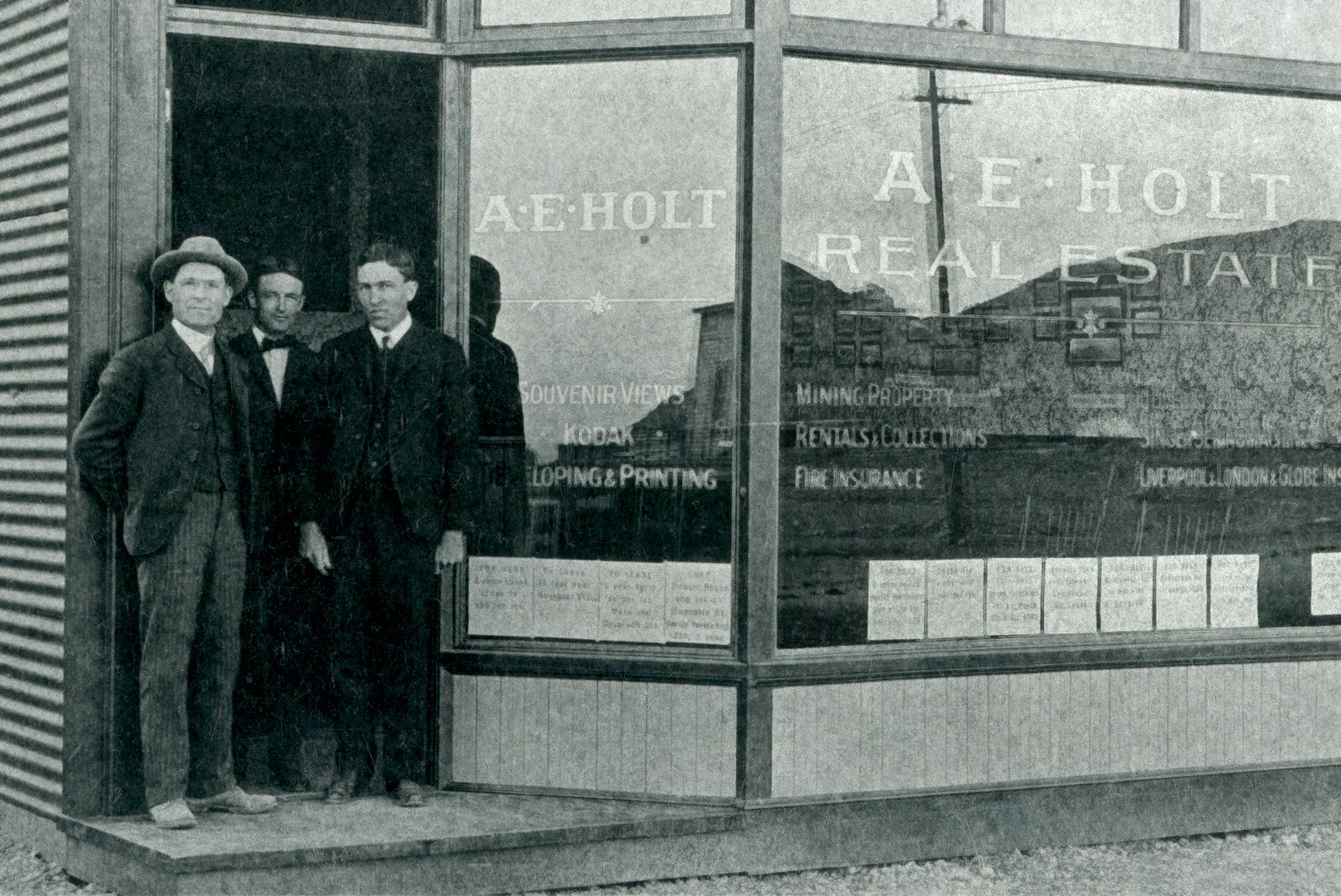 Holt, however, then sought to make his fortune not in printer’s ink or gold mining, but in the town’s red-hot real estate market. As he wrote on the photo-postcard of his new storefront (below),