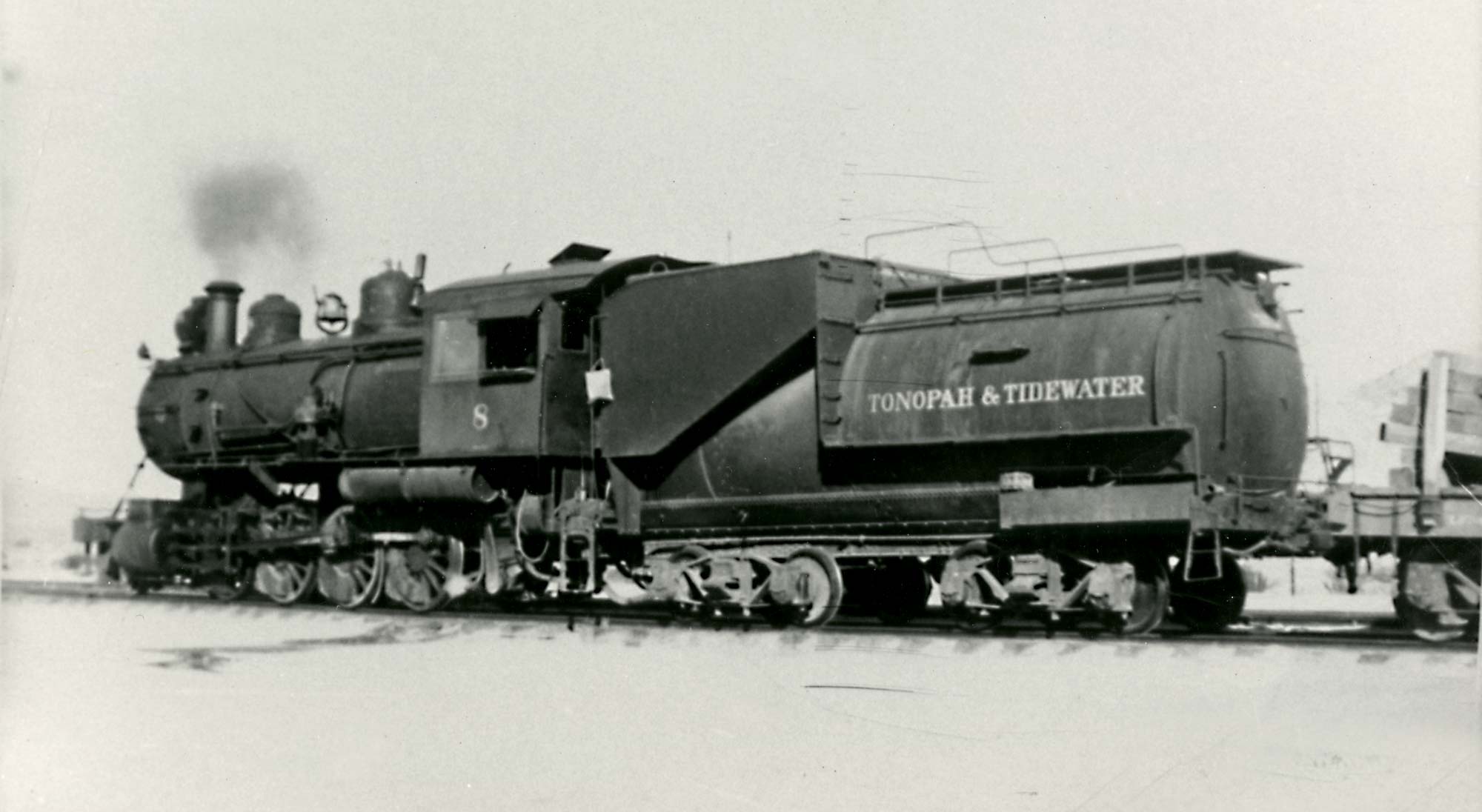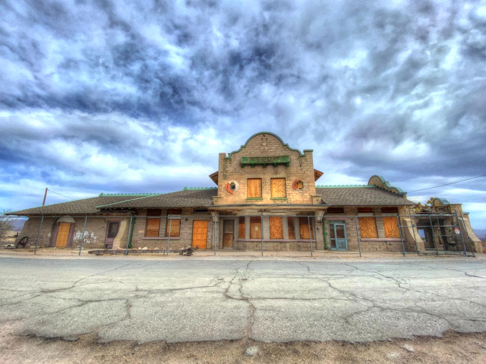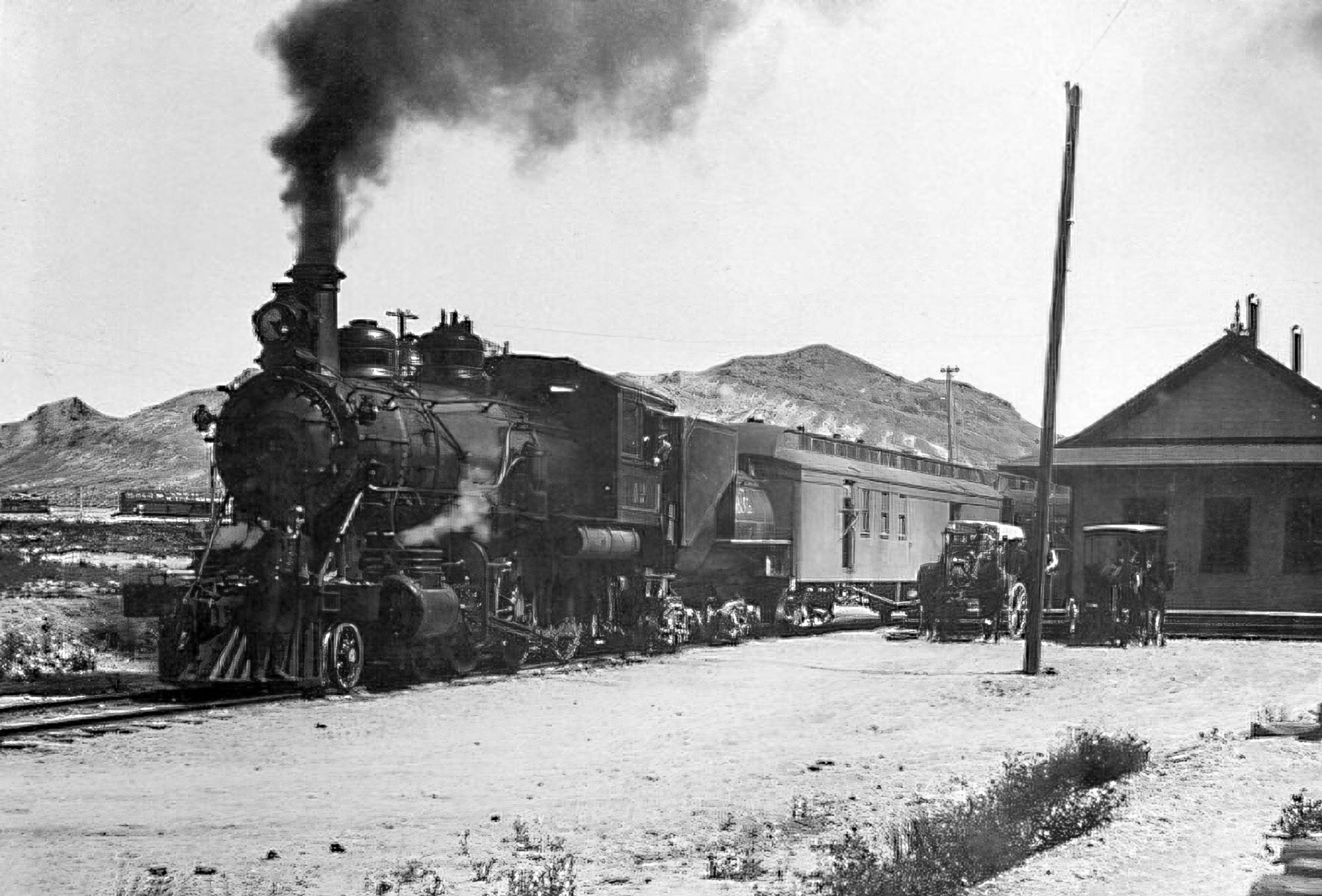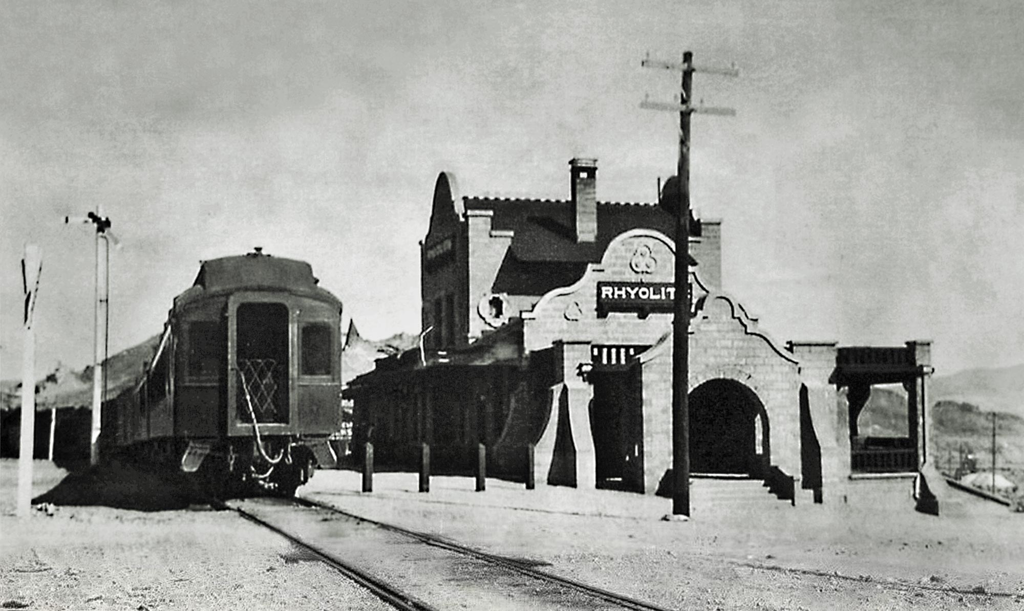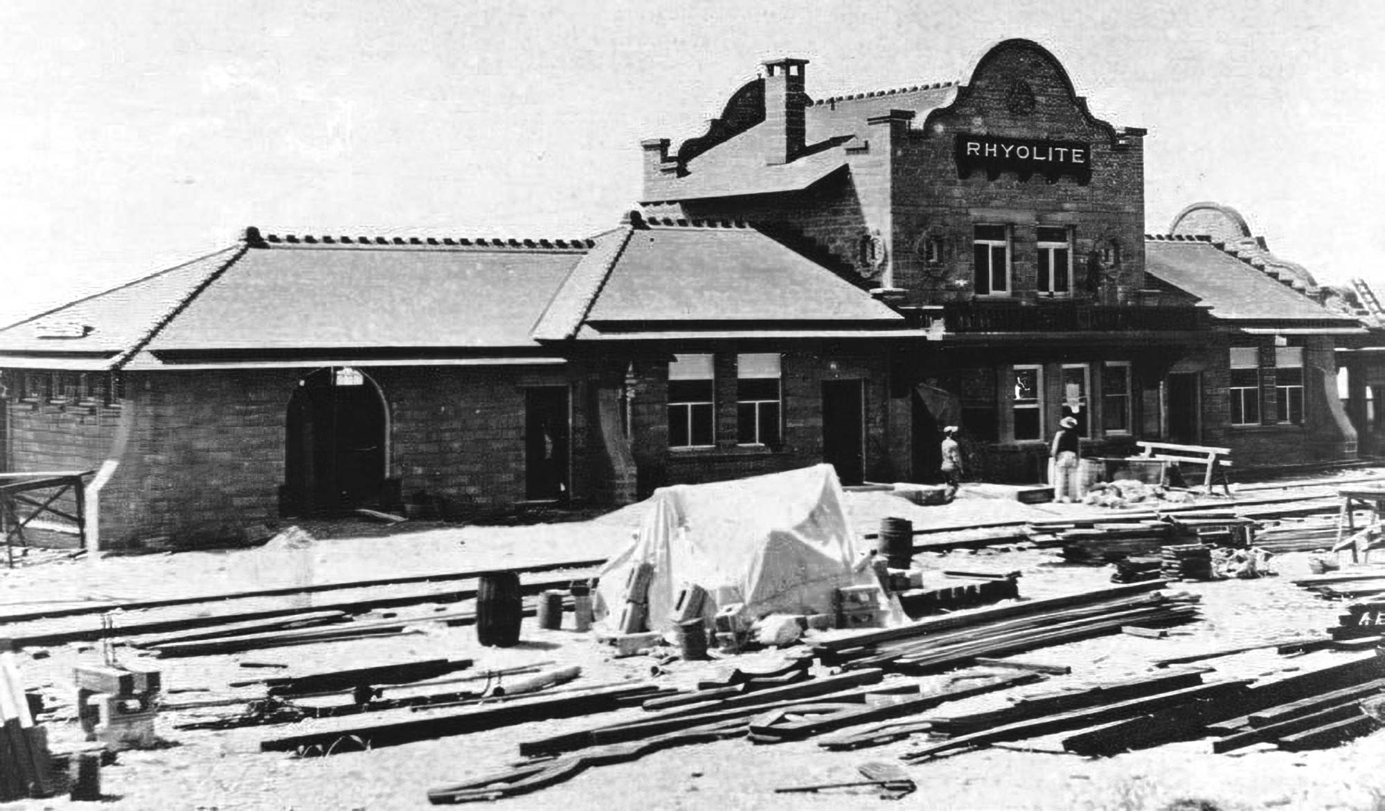 Rail access cemented Rhyolite’s status. Three lines eventually served the town or its immediate vicinity: the Las Vegas & Tonopah (LVT), the Bullfrog Goldfield Railroad, and a connection with the Tonopah & Tidewater through nearby Gold Center. The first passenger train reached the area in late 1906, and by mid‑1907 Rhyolite had one of the most substantial depots in Nevada, built of stone and intended as a showpiece for the LVT. The structure remains standing today, and may be seen in detail within the VR tour.