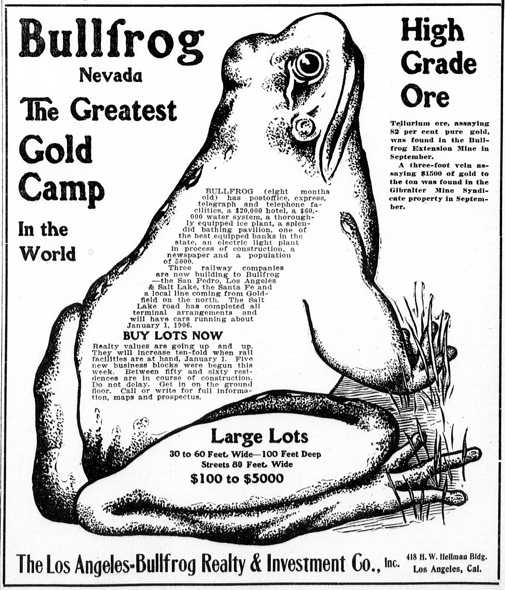 The town was once the commercial center of what was known as the Bullfrog Mining District, an aggregation of camps and townsites—Bullfrog, Beatty, Rhyolite, Pioneer and others—focused on gold-bearing veins in the Bullfrog Hills and adjacent Grapevine Mountains. This setting meant that any settlement would depend entirely on imported water, food, and capital, while being highly exposed to mining’s boom‑and‑bust cycle.