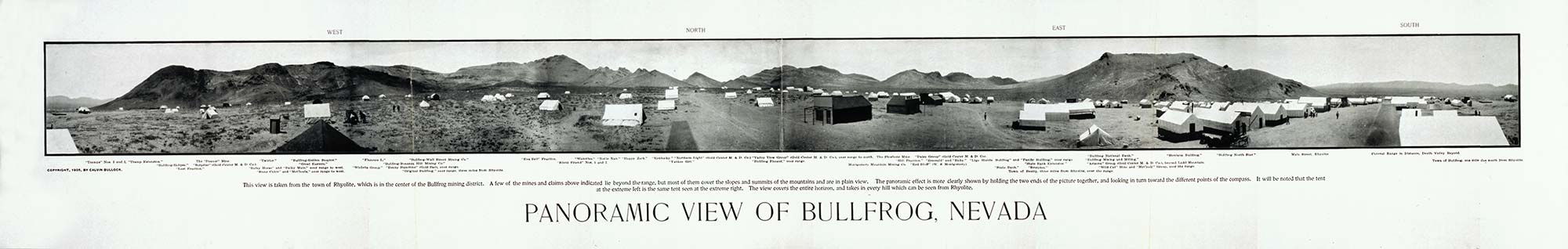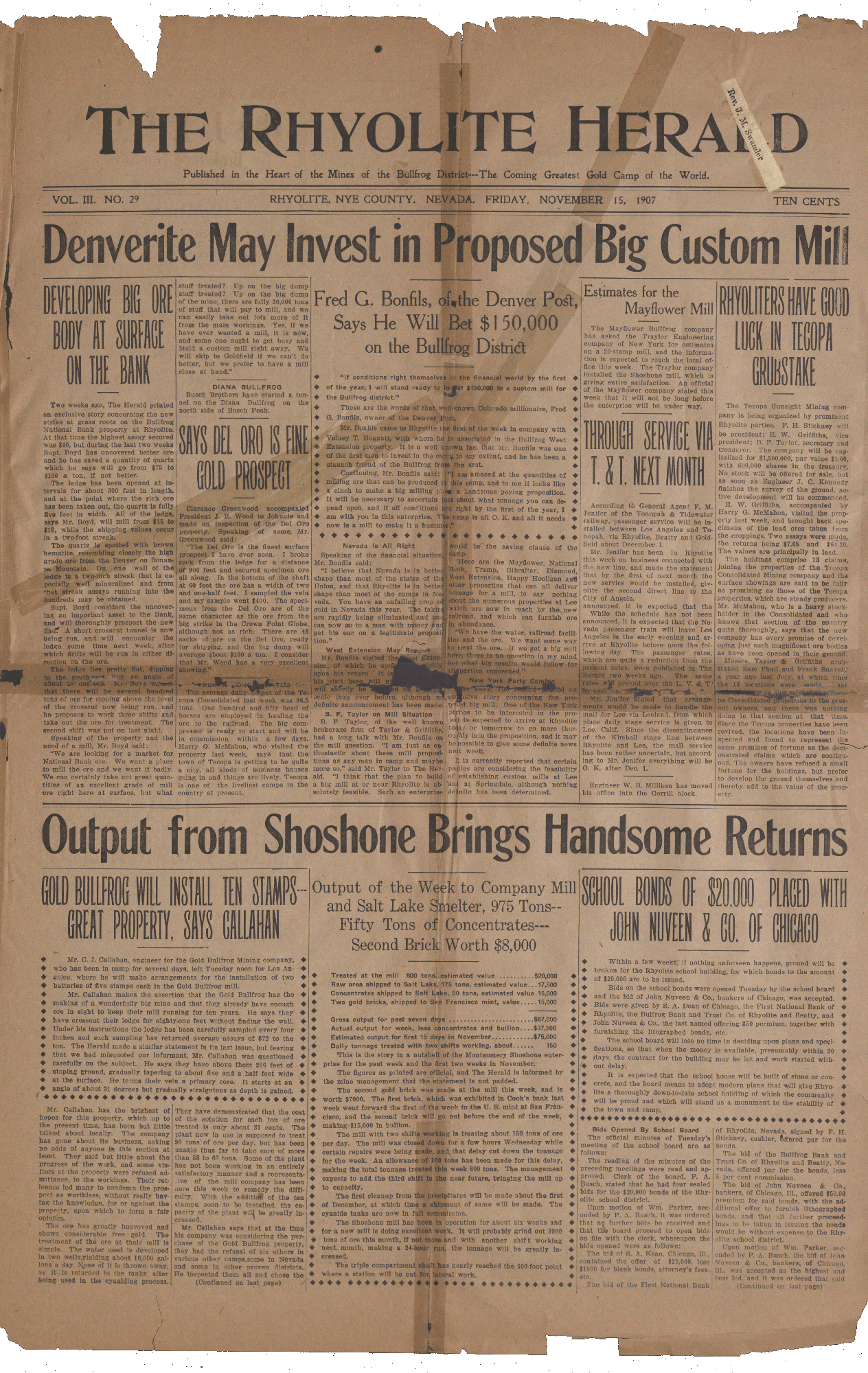 “By June 23, the Herald was on sale in Goldfield, Los Angeles, San Francisco, Denver, and Salt Lake City….Three weeks later the Herald published its first photograph, a front-page panorama of Rhyolite and its mines. It was taken by Allan Holt, who soon became the leading photographer of the newspaper and of the Bullfrog District.”