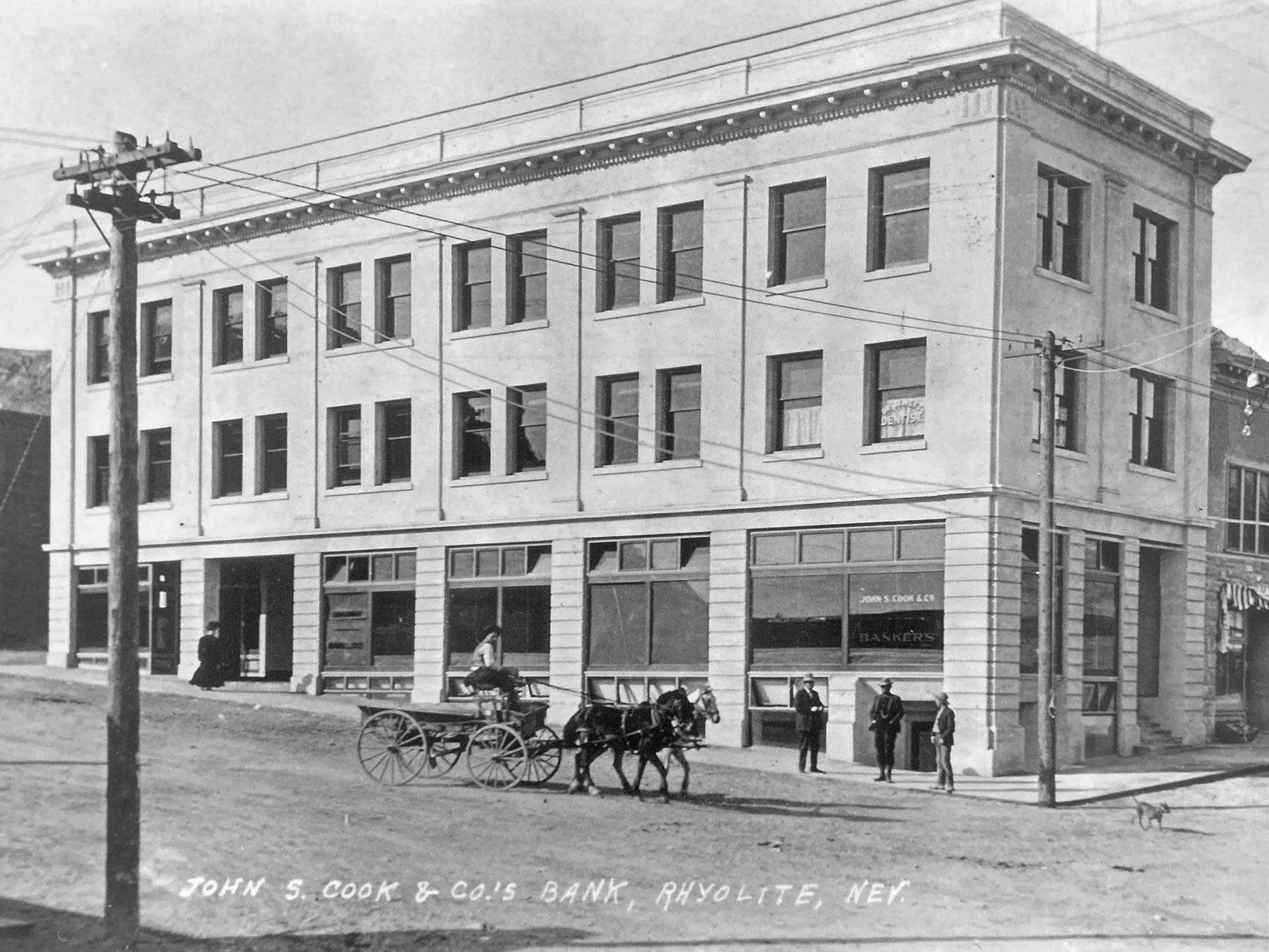 The John S. Cook bank building, also known as the First National Bank of Rhyolite, was completed in January of 1908 at a cost of $60,000 ($2,000,500 in 2024). Located at the corner of Golden and Broadway, no expense was spared in its décor. The doors of its vault each weighted four tons, and the safe inside weight 6600 pounds. It was large enough to hold $1 million in coin. In 1910, after the closure of the bank, anything of value that could be removed—everything from carpets to safety deposit boxes and furniture—was sold at auction for $2,000.