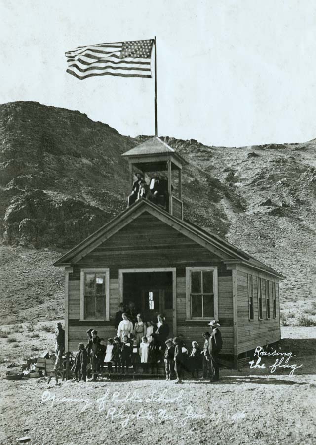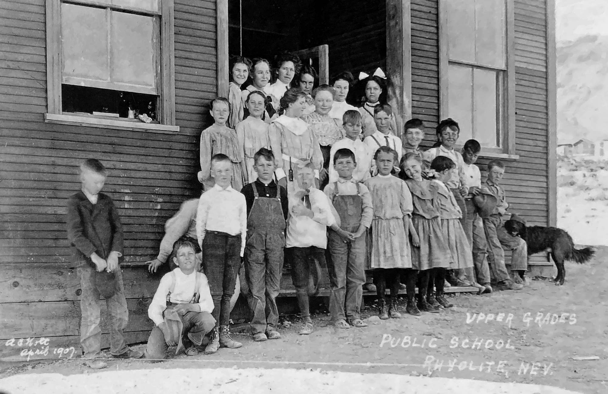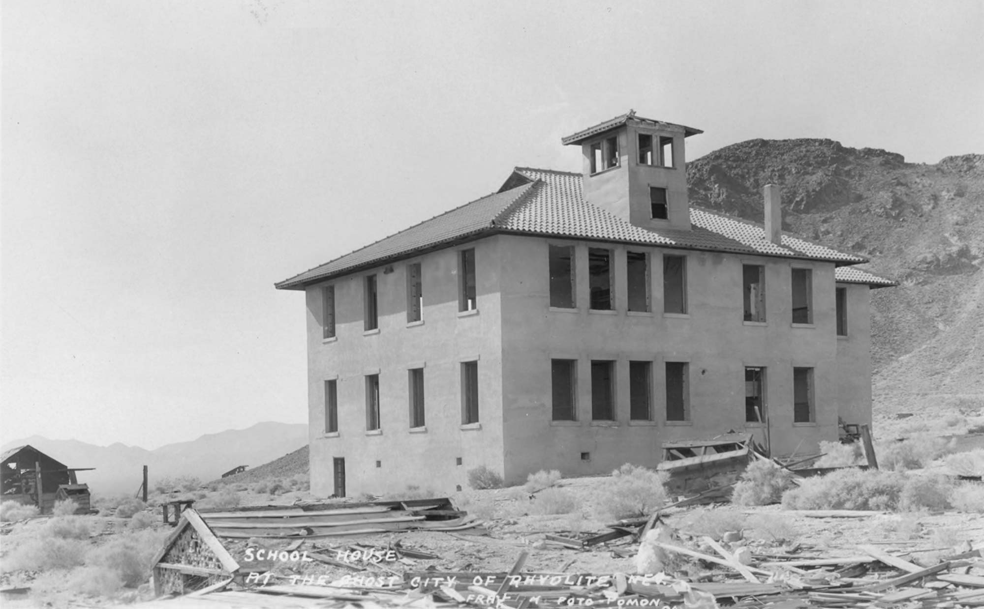 Social and civic institutions were equally ambitious. The town supported newspapers (notably the Rhyolite Herald), a stock exchange, a Board of Trade, fraternal lodges, churches, and a Miners Union Hospital linked to the Bonanza Miners Union. A school district was organized almost as soon as the camp formed; after initial classes in temporary buildings, bonds were approved in 1907 for a large two‑story concrete school completed in late 1908, with elementary school classes as well as a high‑school department.