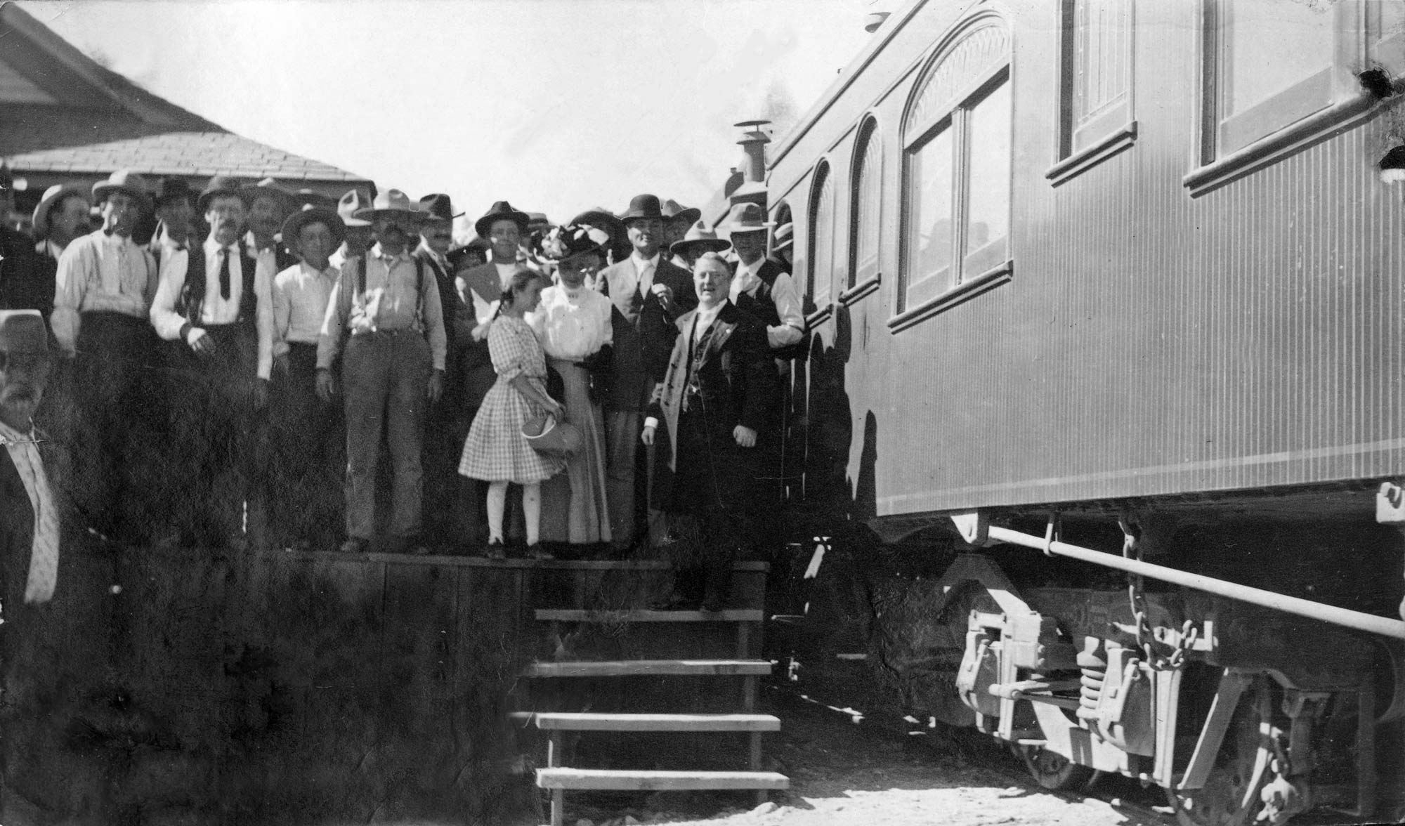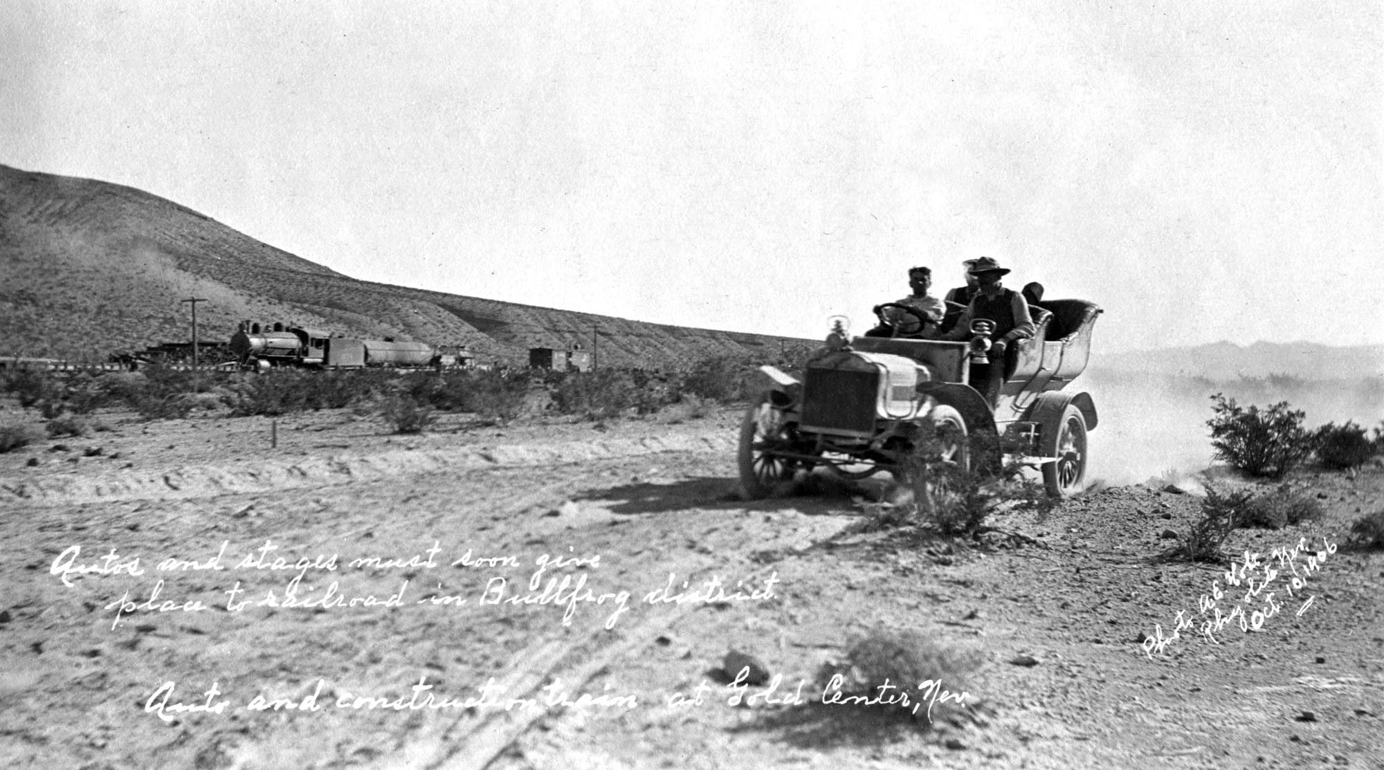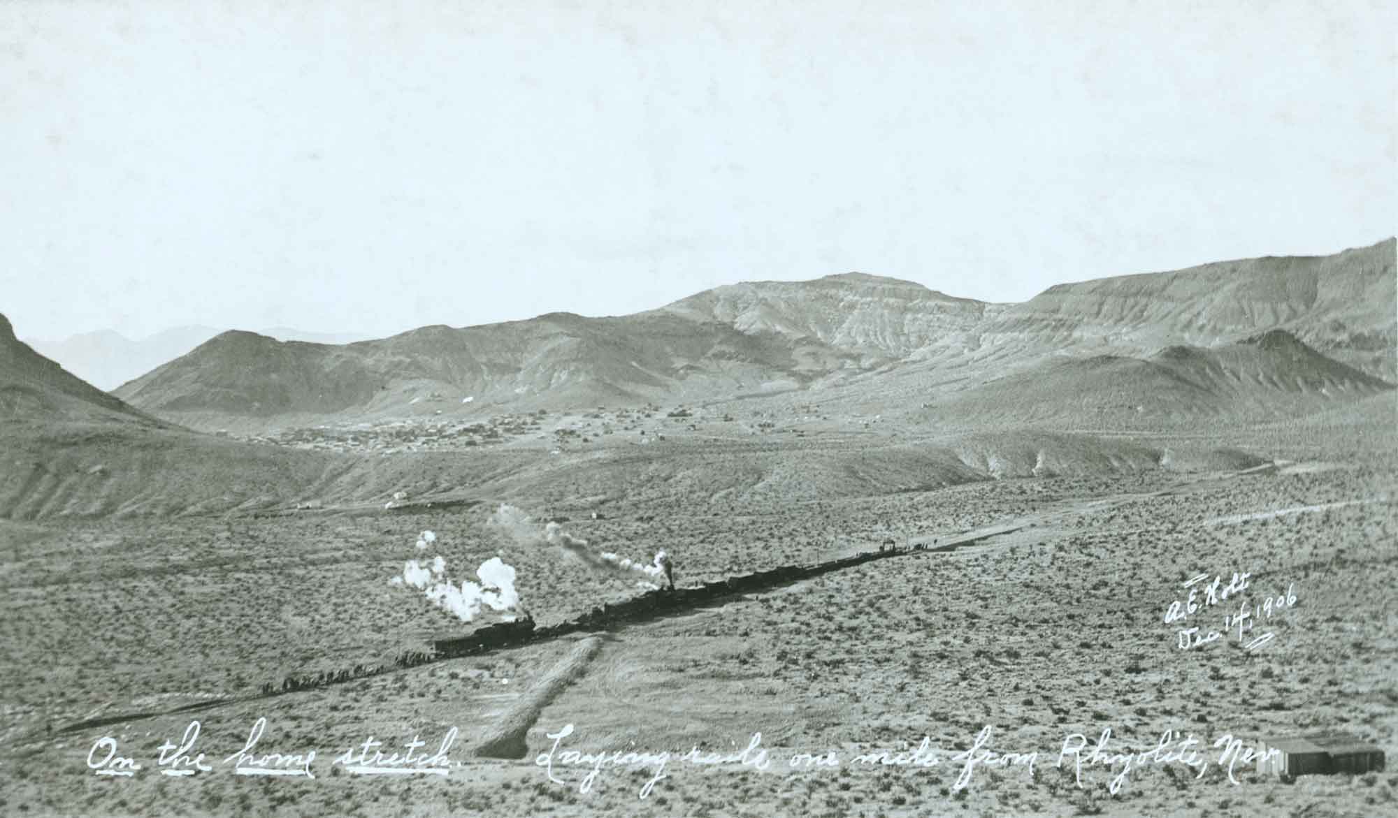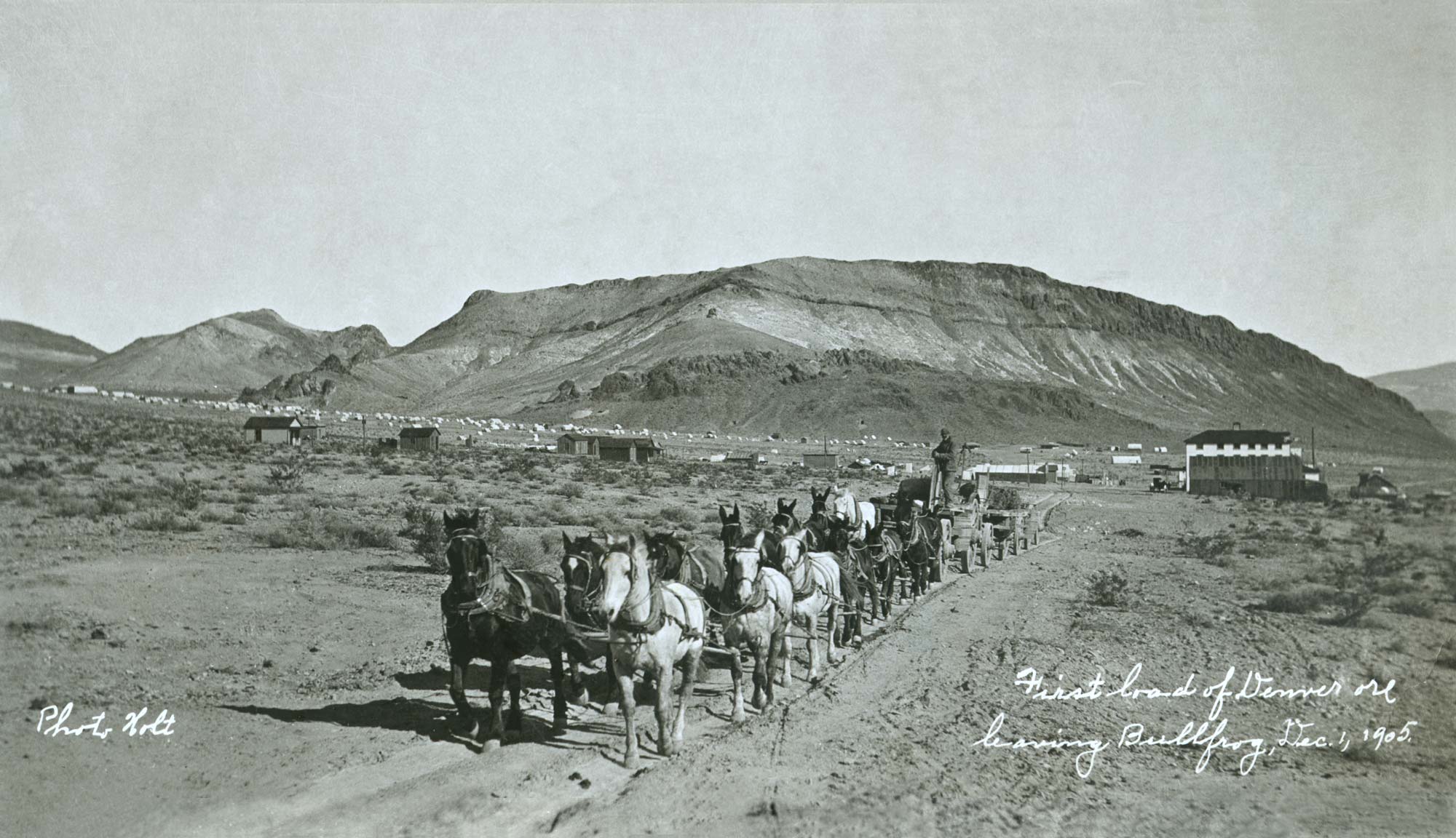 With his innate sense of composition and his instinct for the decisive moment, Holt documented each of the Bullfrog mines, and all of the milestones of Rhyolite’s ascent, such as the departure of the first shipment of gold ore, or the arrival of the first passenger train. The distribution of these images, many as postcards, served to publicize the town’s rising status and thus likely did no harm to the photographer’s bread and butter, his real estate business.