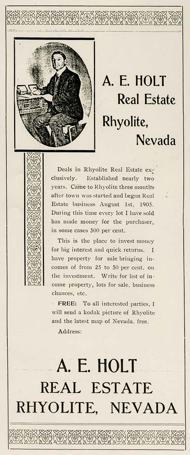 We have no record of his success in real estate, but with his darkroom likely behind his office, and his zeal to record both everyday life and the commercial milestones of Rhyolite’s ascent, we are indebted to Holt for providing more insights to the town’s life than we can ever know from the few skeletal remnants standing today.