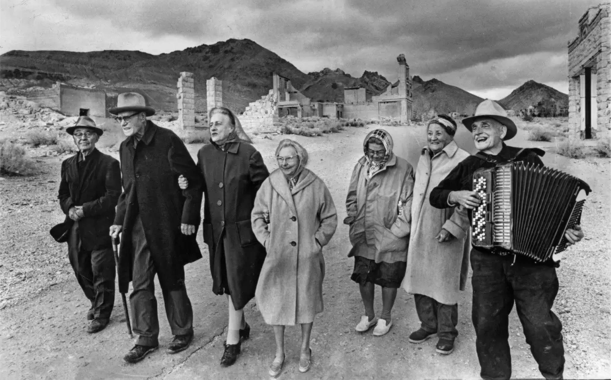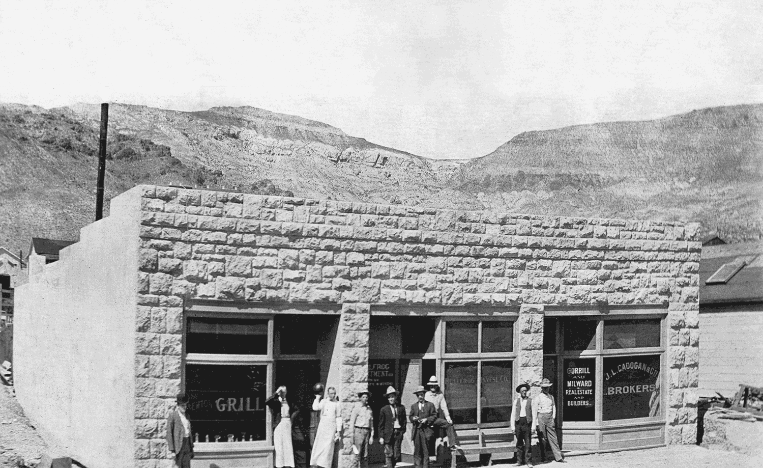 Of all the Nevada ghost towns, Rhyolite had the most spectacular growth, followed by a symmetrically steep and precipitous fall. In the other short-lived boomtowns, there may be nothing to remind the world of what once was, beyond a pile of jumbled concrete or twisted and decayed wooden boards. We may have but a few photographs of the people who rushed to a bonanza rumor or followed a speculative folly even after it was melting into mirage.