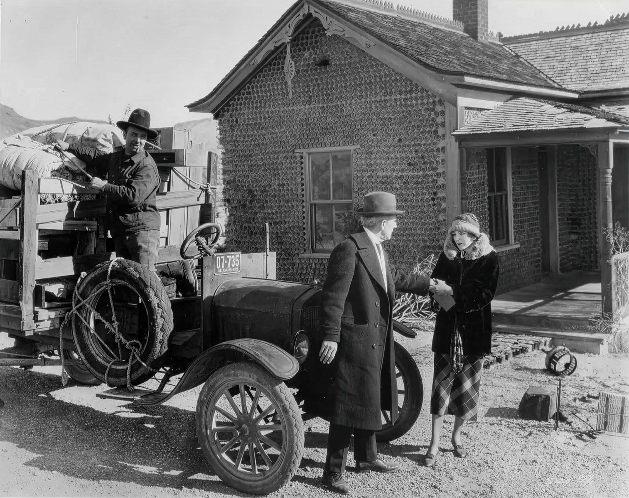 From the 1920s onward, Rhyolite became a backdrop for films and travelogues. Paramount’s Famous Players‑Lasky company restored Tom Kelly’s Bottle House in 1924–25 for the silent film The Air Mail and then turned it over to local custodians. Later Westerns and genre films, including early John Wayne and Roy Rogers pictures and, much later, productions like Cherry 2000, used the depot, bank, and ruins as atmospheric sets.